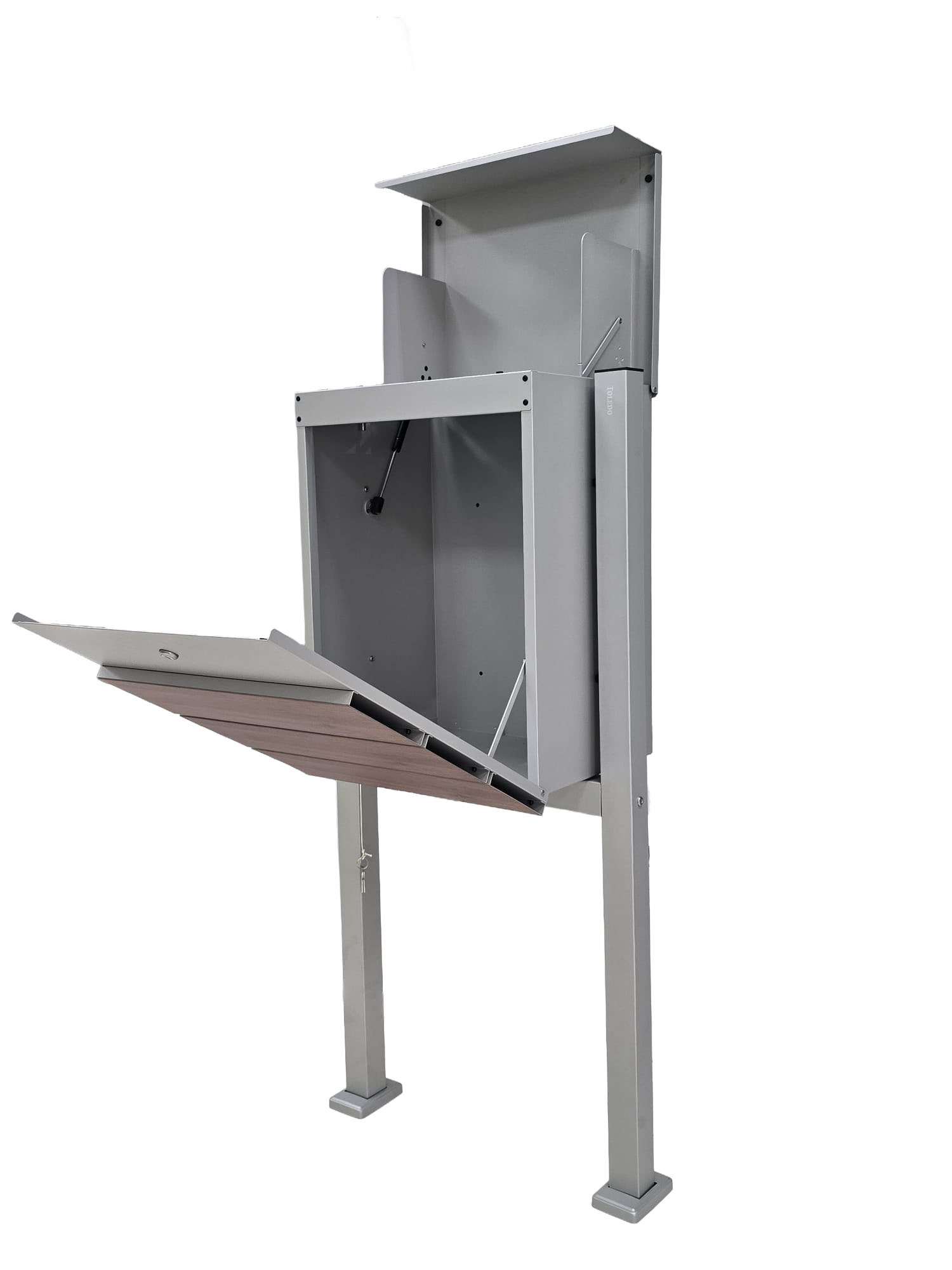 Buzón marca Toledo en color gris satinado y madera Nogal. Tornillos en stainless steel. Incluye base y cerradura con llave.