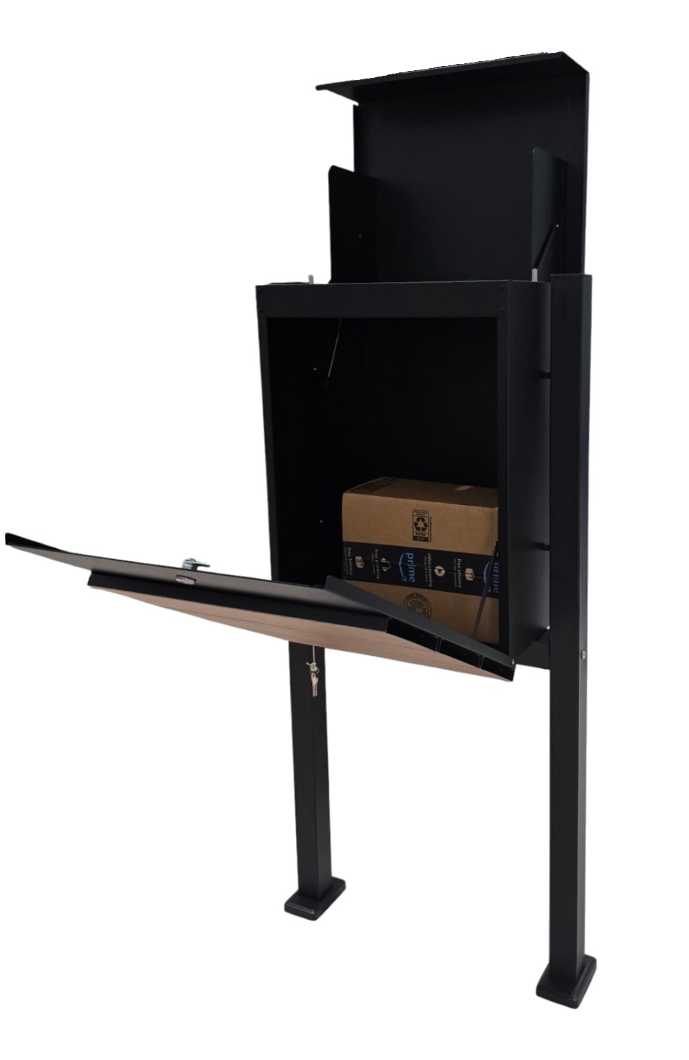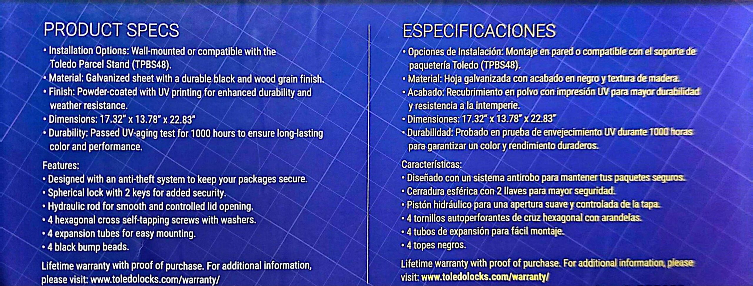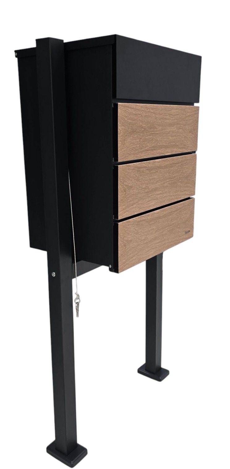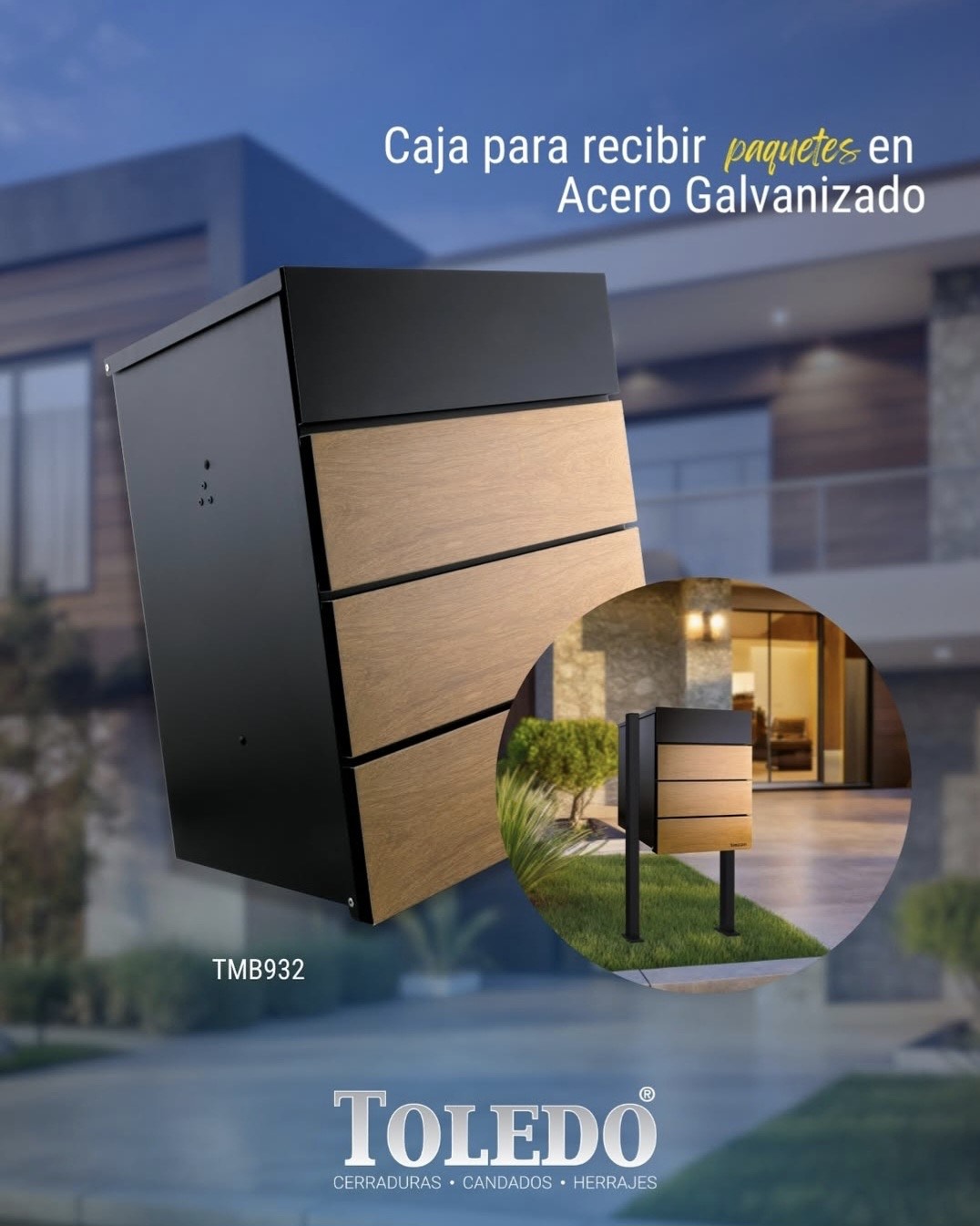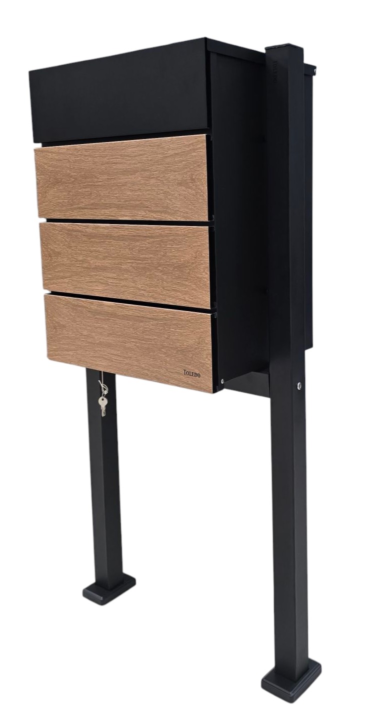 Buzón marca Toledo en metal galvanizado color negro y madera claro. Tornillos en stainless steel. Incluye base y cerradura con llave.